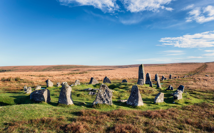 Tauche in eine einzigartige Landschaft ein, voller Magie, Sagen, Naturgeistern und komplexen Steinkreisen. Auf engstem Raum finden sich im Dartmoor in Südengland bis zu 2.000 megalithische Anlagen - eine riesige sakrale Landschaft.